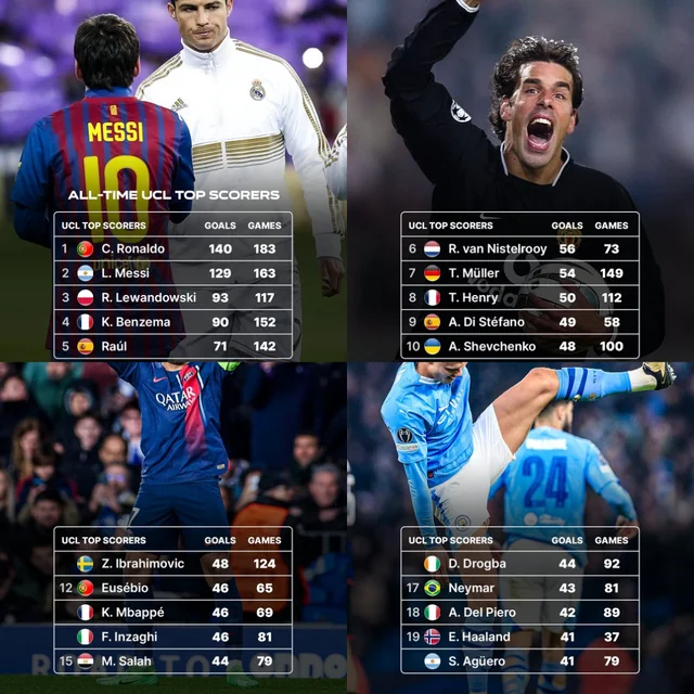 欧冠历史射手榜中,几位顶级球员凭借稳定的进球表现长期占据前列。克里斯蒂亚诺·罗纳尔多和梅西分别以超过120个和100个进球高居榜首,展现出惊人的进球效率和稳定性。